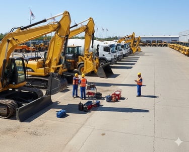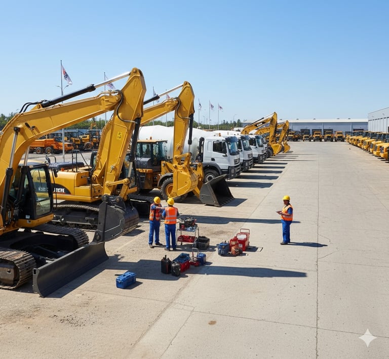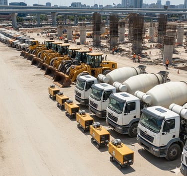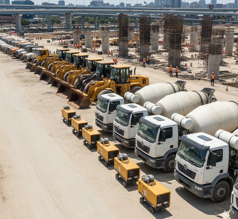 Suministro de equipos como tractores de obras y de plantas, cargadores frontales, camiones, compresoras de aire y mezcladoras.