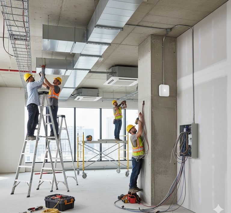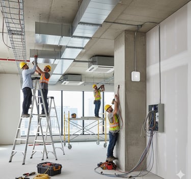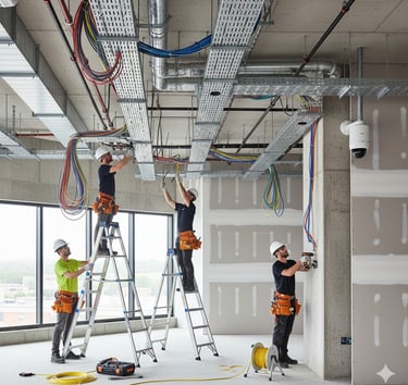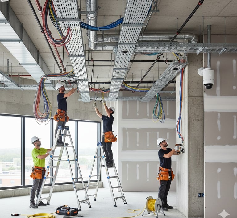 Tendidos eléctricos, telefónicos y de comunicación, incluyendo instalación de circuitos cerrados de TV. Integración de sistemas de cableado, conexiones y canalización de dispositivos